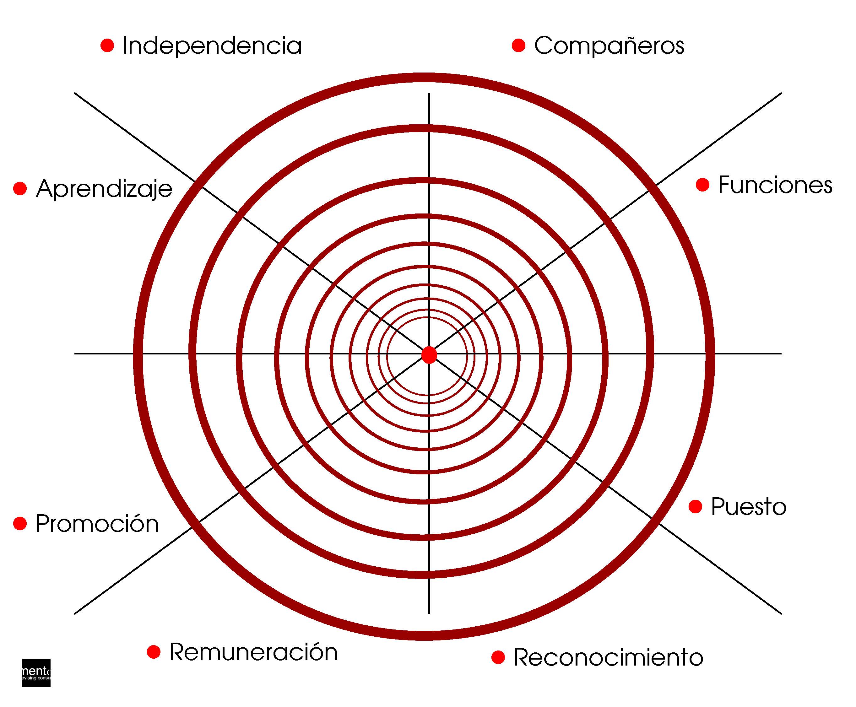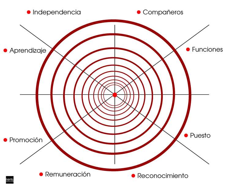 A modo de ejemplo práctico, podríamos configurar la siguiente ‘rueda de la vida’ por objetivos profesionales, aunque lógicamente esta cambia en función de los objetivos que nos planteemos.