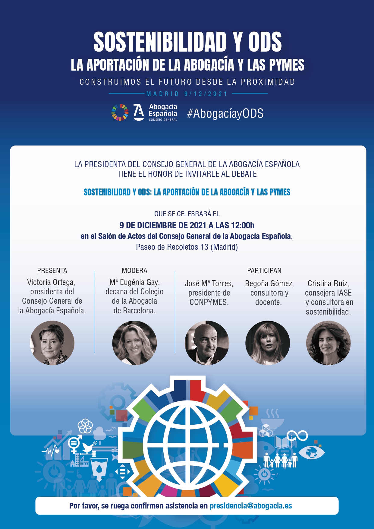 LA PRESIDENTA DEL CONSEJO GENERAL DE LA ABOGACÍA ESPAÑOLA TIENE EL HONOR DE INVITARLE AL DEBATE SOSTENIBILIDAD Y ODS: LA APORTACIÓN DE LA ABOGACÍA Y LAS PYMES. Con esta invitación de Victoria Ortega -Presidenta del Consejo General de la Abogacía-, me incorporaba al panel moderado por María Eugenia Gay -Decana del Colegio de la Abogacía … Continuar leyendo «La aportación de la Abogacía y las PYMES. Construimos futuro desde la proximidad»